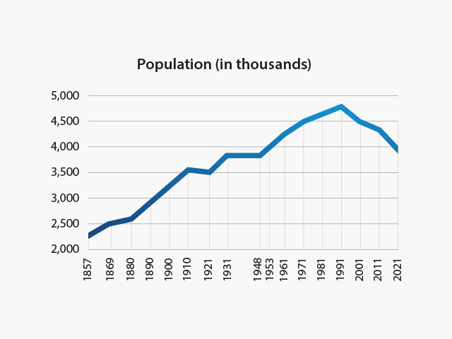 Although the population of Croatia has almost doubled in the last 160 years (1857–2021), this is low in comparison to other countries (for example, the population of The Netherlands increased 5.3 times in the same period). The population has on the whole increased, with a particularly high rate at the end of the 19th century, when it entered the first phase of demographic transition, marked by high rates of natural change. However, in the early 20th century emigration increased, and the rate of population growth fell, while the outbreak of the First World War and the Spanish Flu epidemic led to the first actual decrease in the population. After recovering slightly in the 1920s, war again followed, and there was a second fall in population levels. The growth of the population from the 1960s to the 1980s was slowed by a decrease in natural change, directly linked to a decrease in the birth rate, accompanied by marked emigration for 'temporary work' abroad. In these circumstances, the population of Croatia went through an accelerated demographic transition. By the end of the 1980s, a low rate of natural change was noted, which was not at all in line with the rate of economic development. With such a weakened (particularly reproductive) population base, Croatia faced yet another war in the 1990s, followed by an insecure post-war period, the consequence of which was a third drop in population numbers at the turn of the 21st century. This decline has further been intensified by emigration, mostly to Germany, Ireland and Austria, after Croatia became a member of the European Union. According to the 2021 census, a total of 3,9 million people live in the country, with a population density of 68 people per km².