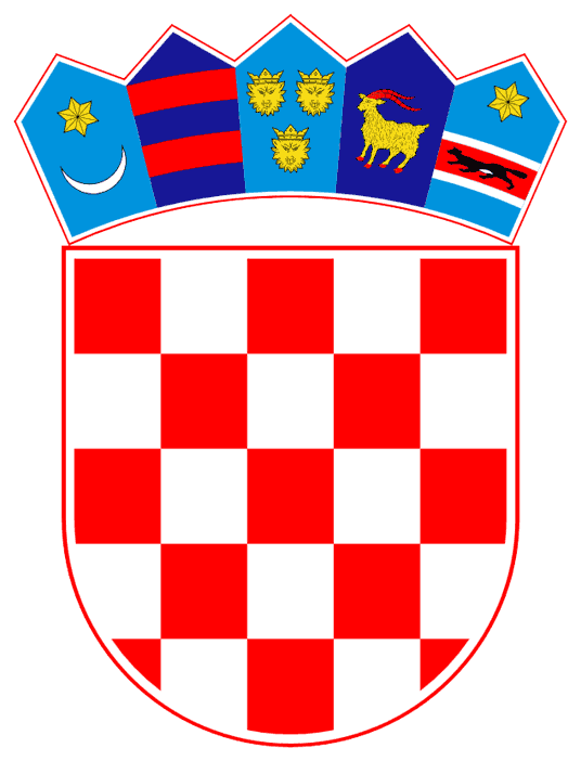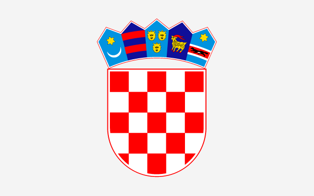 Brasão de armas. O brasão está em uso oficial desde 1990. É o brasão histórico da Croácia em forma de escudo, dividido em 25 campos vermelhos e brancos (prateados). Os cinco escudos mais pequenos na coroa por cima do brasão são brasões históricos (da esquerda para a direita): o brasão croata mais antigo conhecido e os brasões da República de Dubrovnik, Dalmácia, Ístria e Eslavónia. O brasão histórico da Croácia aparece em diversas ocasiões desde o século XV. O brasão com campos de 8 por 8 foi encontrado no documento de 1527, pelo qual o Parlamento Croata (Hrvatski sabor) confirmou a eleição de Fernando I de Habsburgo como rei da Croácia, tendo-se tornado a base para os brasões croatas posteriores dentro da Monarquia dos Habsburgos. Foi também parte integrante do brasão oficial da República Socialista da Croácia até 1990.